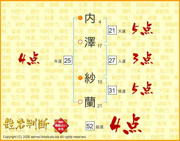 内(4画)澤(17画) 紗(10画)蘭(21画)