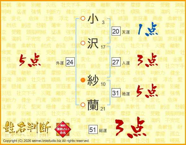 小(3画)沢(17画) 紗(10画)蘭(21画)
