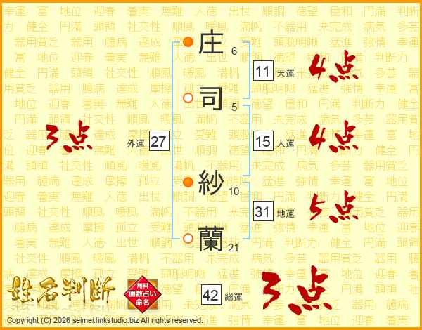 庄(6画)司(5画) 紗(10画)蘭(21画)