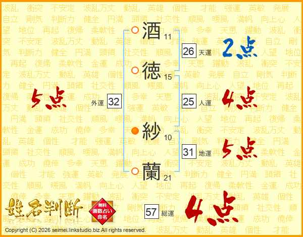 酒(11画)徳(15画) 紗(10画)蘭(21画)