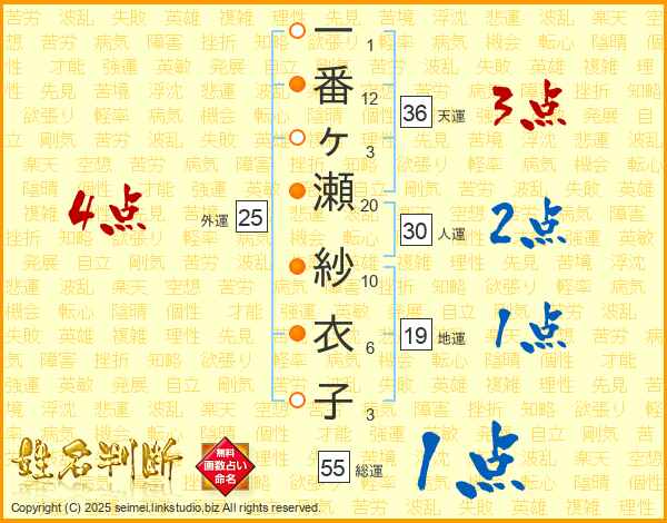 一番ヶ瀬紗衣子さんの総運は55画の1点!