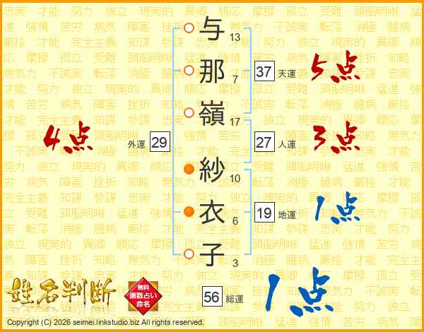 与(13画)那(7画)嶺(17画) 紗(10画)衣(6画)子(3画)