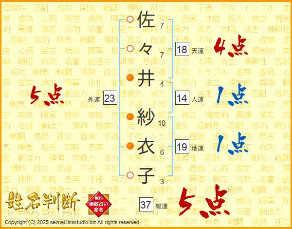 佐(7画)々(7画)井(4画) 紗(10画)衣(6画)子(3画)