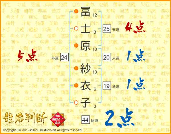 冨(12画)士(3画)原(10画) 紗(10画)衣(6画)子(3画)
