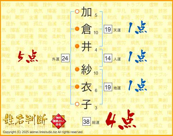 加(5画)倉(10画)井(4画) 紗(10画)衣(6画)子(3画)