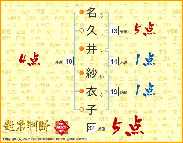 名(6画)久(3画)井(4画) 紗(10画)衣(6画)子(3画)