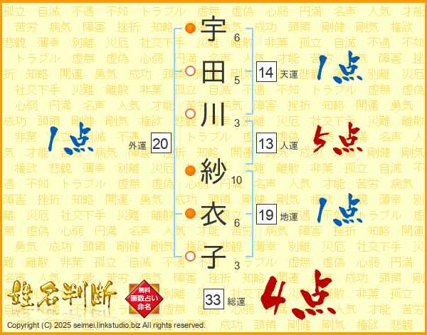 宇(6画)田(5画)川(3画) 紗(10画)衣(6画)子(3画)
