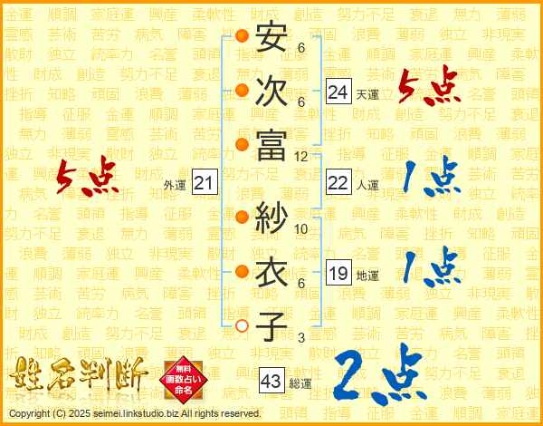 安(6画)次(6画)富(12画) 紗(10画)衣(6画)子(3画)