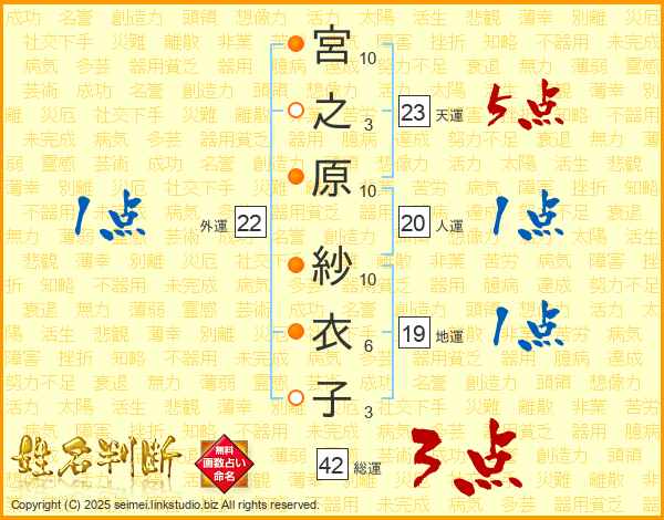 宮(10画)之(3画)原(10画) 紗(10画)衣(6画)子(3画)