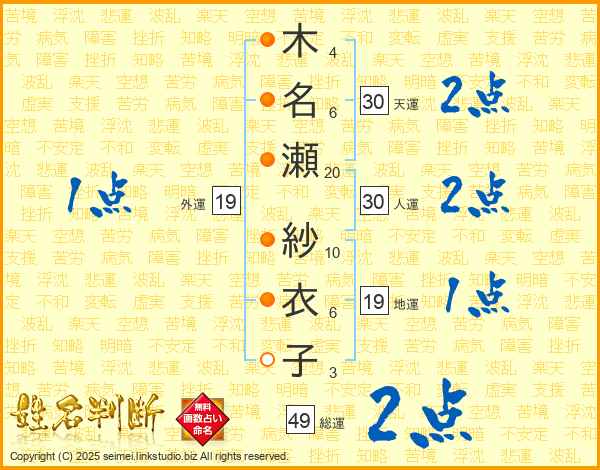木(4画)名(6画)瀬(20画) 紗(10画)衣(6画)子(3画)