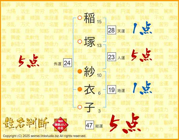 稲(15画)塚(13画) 紗(10画)衣(6画)子(3画)