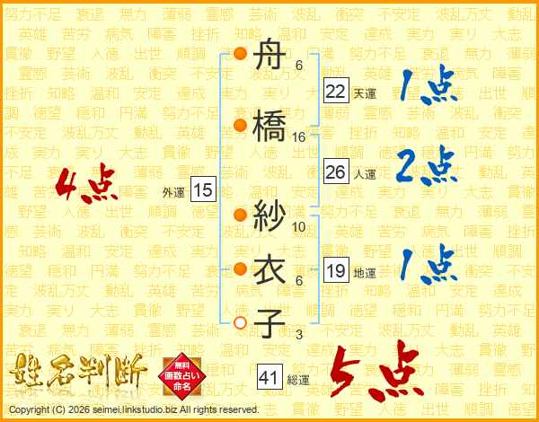 舟(6画)橋(16画) 紗(10画)衣(6画)子(3画)