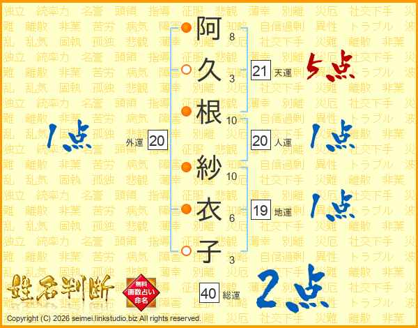 阿久根紗衣子さんの総運は40画の2点!