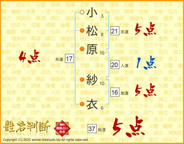 小松原紗衣さんの総運は37画の5点!