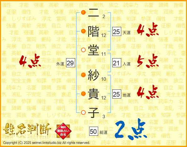 二(2画)階(12画)堂(11画) 紗(10画)貴(12画)子(3画)