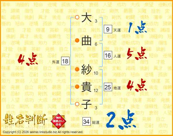 大(3画)曲(6画) 紗(10画)貴(12画)子(3画)