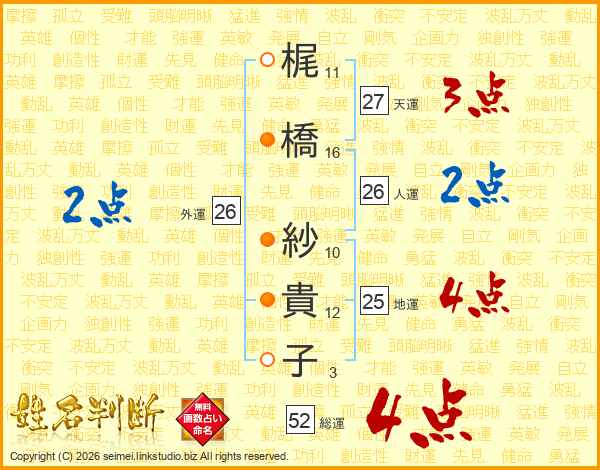 梶(11画)橋(16画) 紗(10画)貴(12画)子(3画)