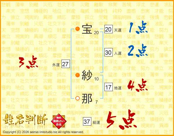 宝(20画) 紗(10画)那(7画)