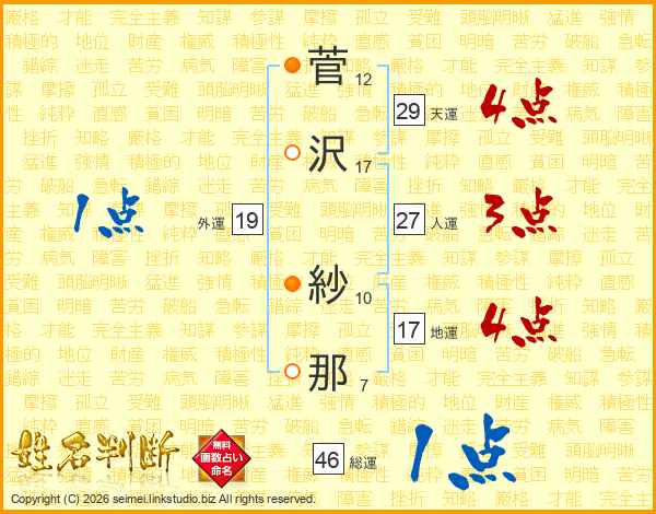 菅(12画)沢(17画) 紗(10画)那(7画)