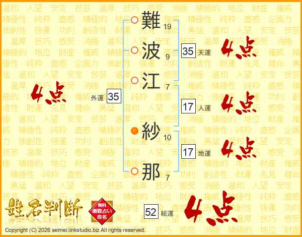 難(19画)波(9画)江(7画) 紗(10画)那(7画)