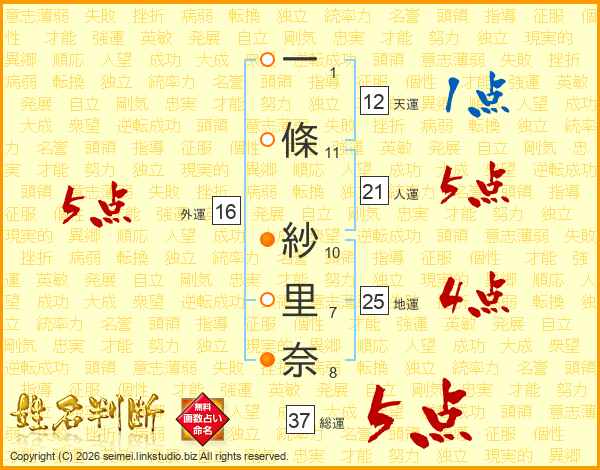 一(1画)條(11画) 紗(10画)里(7画)奈(8画)