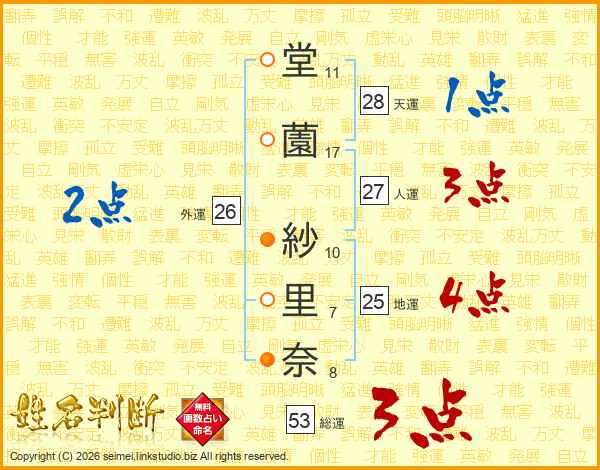 堂(11画)薗(17画) 紗(10画)里(7画)奈(8画)
