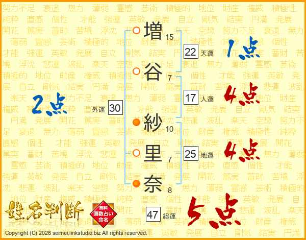 増(15画)谷(7画) 紗(10画)里(7画)奈(8画)