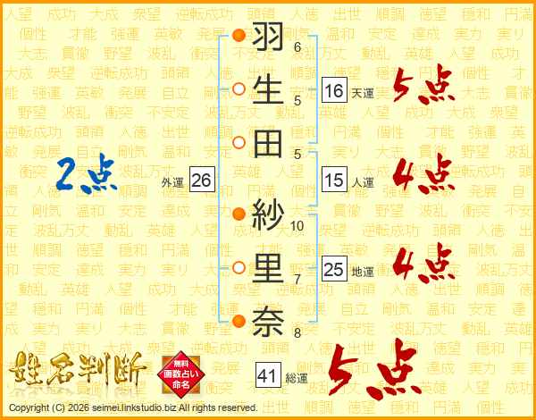 羽(6画)生(5画)田(5画) 紗(10画)里(7画)奈(8画)
