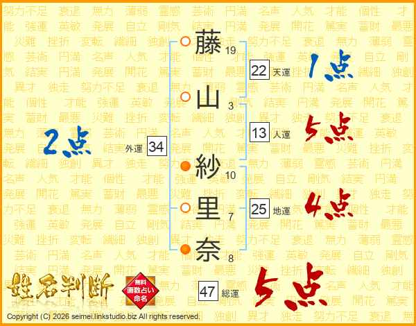 藤(19画)山(3画) 紗(10画)里(7画)奈(8画)