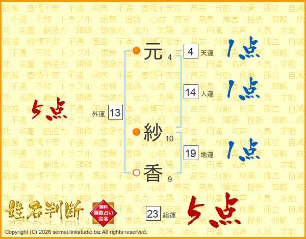 元(4画) 紗(10画)香(9画)