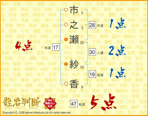 市(5画)之(3画)瀬(20画) 紗(10画)香(9画)
