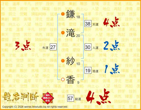 鎌(18画)滝(20画) 紗(10画)香(9画)