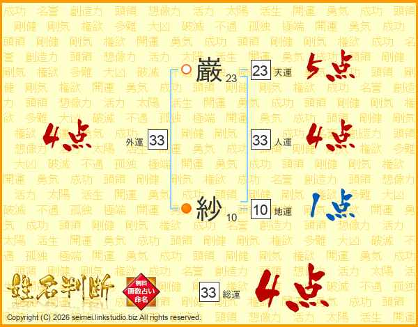 生活面を象徴する運勢です。外部から受ける影響力を表し、結婚運、家庭運や職場、環境への順応性を表します。総運から人運を引いた画数。姓や名が1文字の場合を除く。