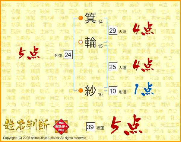 生活面を象徴する運勢です。外部から受ける影響力を表し、結婚運、家庭運や職場、環境への順応性を表します。総運から人運を引いた画数。姓や名が1文字の場合を除く。