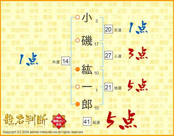 小(3画)磯(17画) 紘(10画)一(1画)郎(10画)