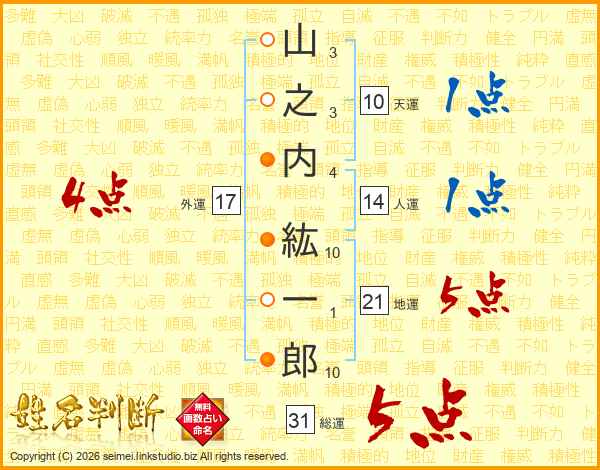 生活面を象徴する運勢です。外部から受ける影響力を表し、結婚運、家庭運や職場、環境への順応性を表します。総運から人運を引いた画数。姓や名が1文字の場合を除く。