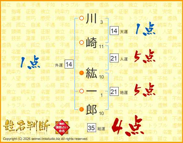 川(3画)崎(11画) 紘(10画)一(1画)郎(10画)