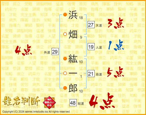 浜(18画)畑(9画) 紘(10画)一(1画)郎(10画)
