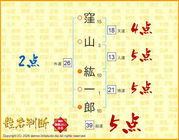 窪山紘一郎さんの総運は39画の5点!