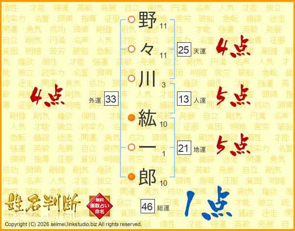 野(11画)々(11画)川(3画) 紘(10画)一(1画)郎(10画)