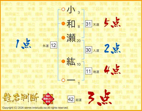 小和瀬紘一さんの天運は31画の5点!