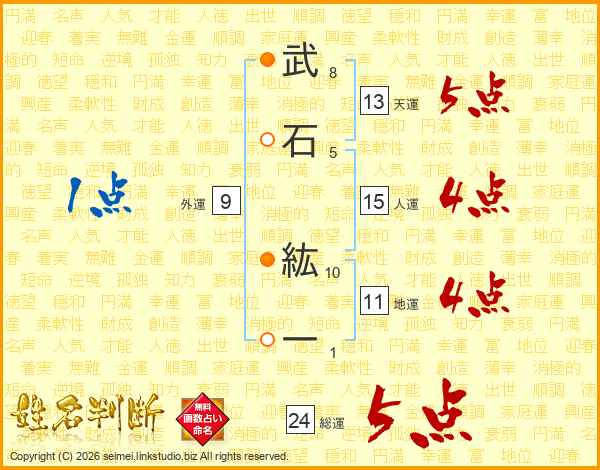 生活面を象徴する運勢です。外部から受ける影響力を表し、結婚運、家庭運や職場、環境への順応性を表します。総運から人運を引いた画数。姓や名が1文字の場合を除く。
