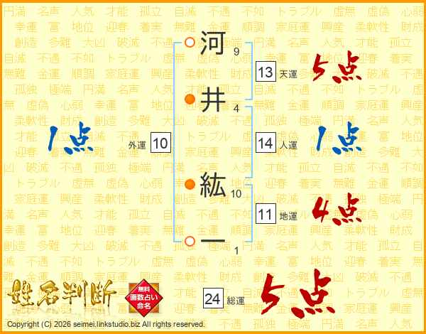 生活面を象徴する運勢です。外部から受ける影響力を表し、結婚運、家庭運や職場、環境への順応性を表します。総運から人運を引いた画数。姓や名が1文字の場合を除く。