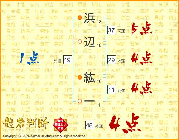 浜(18画)辺(19画) 紘(10画)一(1画)