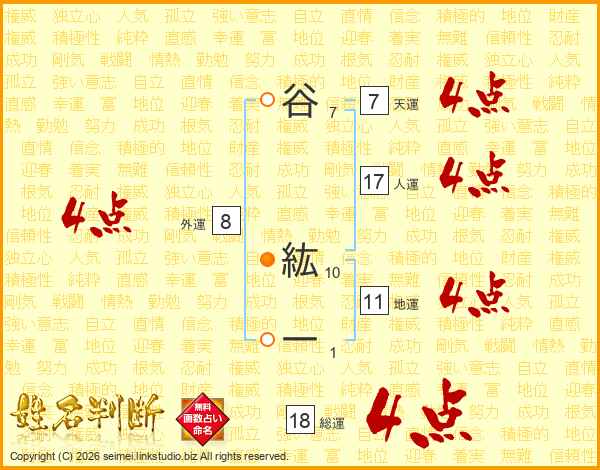 あなたの人生を表す1番重要な運勢です。生涯を通じて影響する総合運となり、主に50歳以降の晩年期に影響を及ぼします。苗字と名前の合計画数。