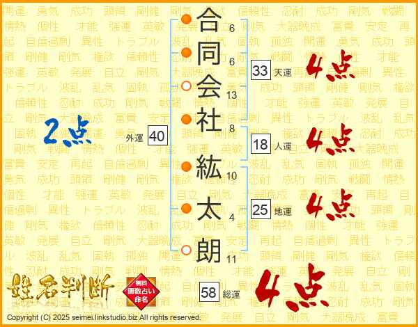 合(6画)同(6画)会(13画)社(8画) 紘(10画)太(4画)朗(11画)