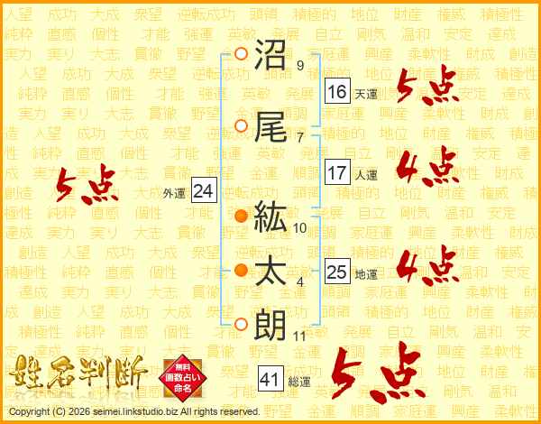 沼(9画)尾(7画) 紘(10画)太(4画)朗(11画)