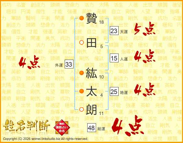 贄(18画)田(5画) 紘(10画)太(4画)朗(11画)