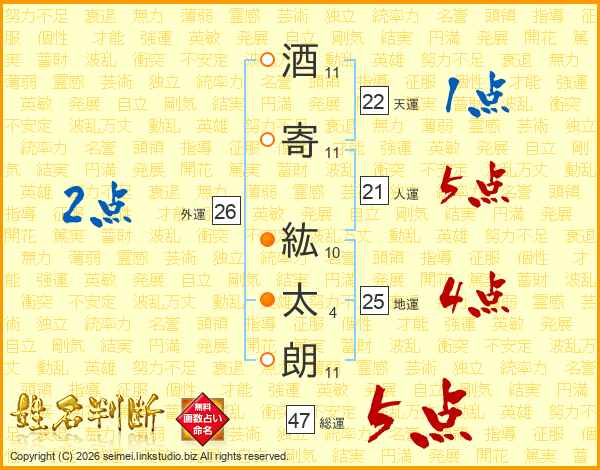 酒(11画)寄(11画) 紘(10画)太(4画)朗(11画)
