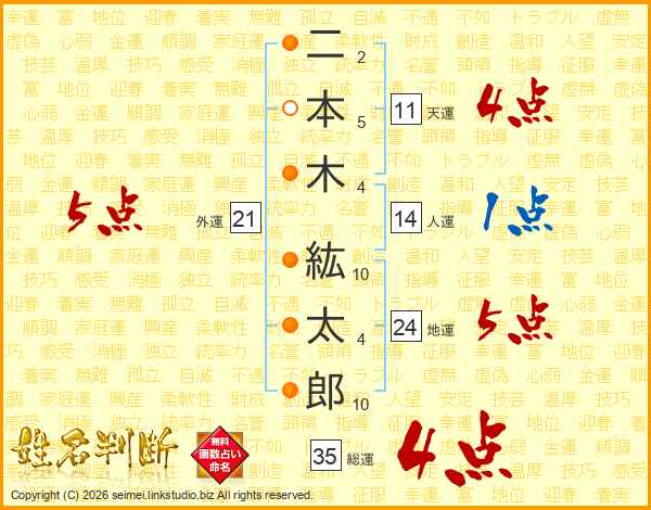 二(2画)本(5画)木(4画) 紘(10画)太(4画)郎(10画)